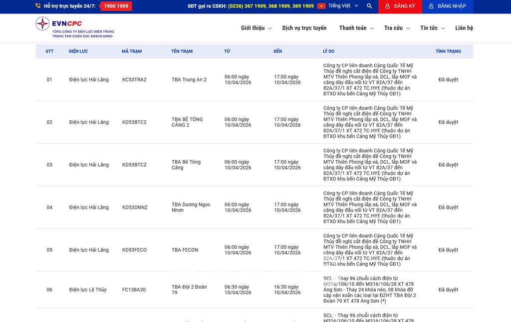 | 5 | Điện lực Hải Lăng | KD53FECO | TBA FECON | 06:00 10/04/2026 | 17:00 10/04/2026 | Công ty CP liên doanh Cảng Quốc Tế Mỹ Thủy đề nghị cắt điện để Công ty TNHH MTV Thiên Phong lắp xà, DCL, lắp MOF và căng dây đấu nối từ VT 82A/37 đến 82A/37/1 XT 472 TC.HYE (thuộc dự án ĐTXD khu bến Cảng Mỹ Thủy GĐ1) | Đã duyệt |