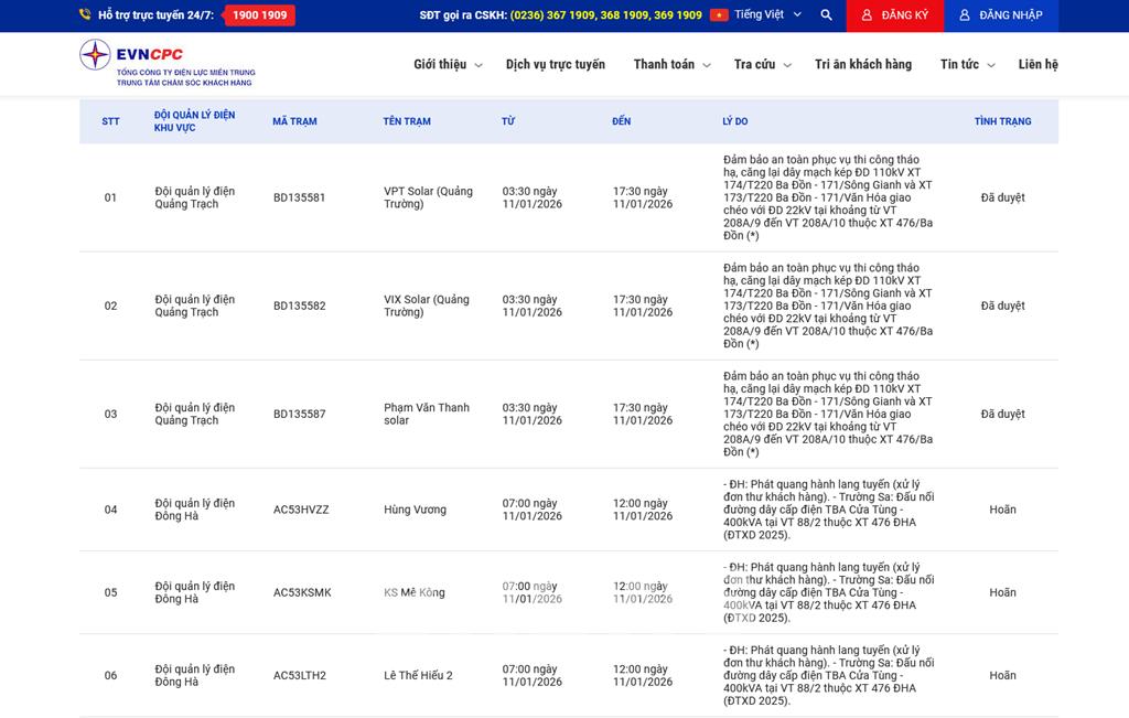 | 1 | Đội quản lý điện Quảng Trạch | BD135581 | VPT Solar (Quảng Trường) | 03:30 11/01/2026 | 17:30 11/01/2026 | Đảm bảo an toàn phục vụ thi công tháo hạ, căng lại dây mạch kép ĐD 110kV XT 174/T220 Ba Đồn - 171/Sông Gianh và XT 173/T220 Ba Đồn - 171/Văn Hóa giao chéo với ĐD 22kV tại khoảng từ VT 208A/9 đến VT 208A/10 thuộc XT 476/Ba Đồn (*) | Đã duyệt |
