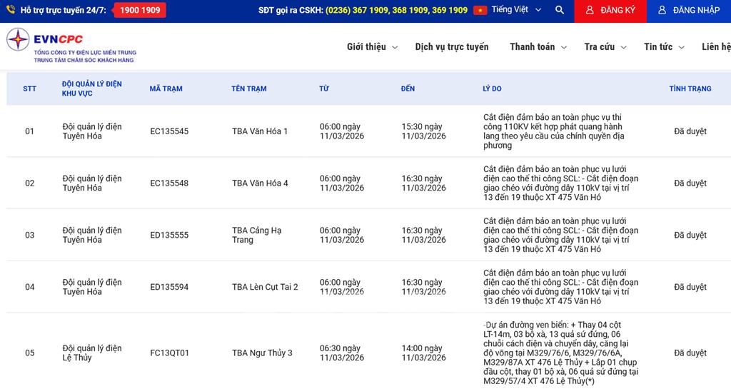 | 1 | Đội quản lý điện Tuyên Hóa | EC135545 | TBA Văn Hóa 1 | 06:00 11/03/2026 | 15:30 11/03/2026 | Cắt điện đảm bảo an toàn phục vụ thi công 110KV kết hợp phát quang hành lang theo yêu cầu của chính quyền địa phương | Đã duyệt |