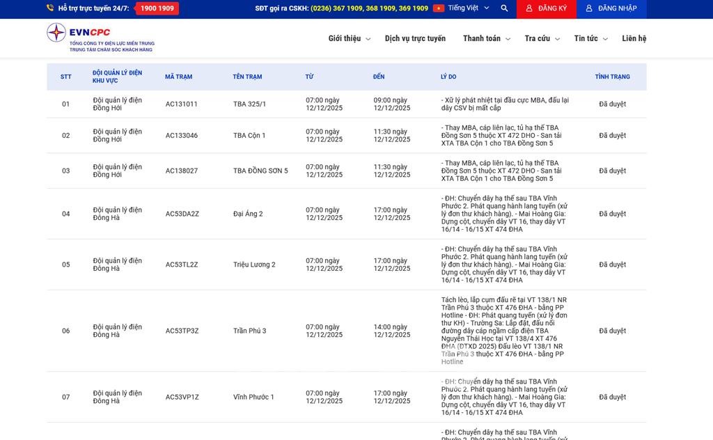 | 5 | Đội quản lý điện Đông Hà | AC53TL2Z | Triệu Lương 2 | 07:00 12/12/2025 | 17:00 12/12/2025 | - ĐH: Chuyển dây hạ thế sau TBA Vĩnh Phước 2. Phát quang hành lang tuyến (xử lý đơn thư khách hàng).- Mai Hoàng Gia: Dựng cột, chuyển dây VT 16, thay dây VT 16/14 - 16/15 XT 474 ĐHA | Đã duyệt |