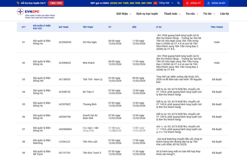 | 3 | Đội quản lý điện Đồпg Hới | AC138053 | TBA TK9 - Nam Lý | 07:00 12/02/2026 | 09:00 12/02/2026 | Thay thế các MBA xuống cấp thuộc SCL 2026 và để đảm bảo vận hành Tết Nguyên Đán | Đã duyệt |