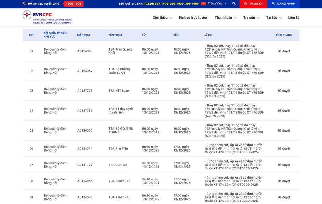 | 2 | Đội quản lý điện Đồпg Hới | AD134057 | TBA Bộ Chỉ huy Quân sự QB | 06:00 13/12/2025 | 16:30 13/12/2025 | - Thay 02 cột, thay 11 bộ xà đỡ, thay 1621m dây NR Trần Quang Khải từ vị trí 171/2 đến vị trí 171/12 thuộc XT 476 BDH (SCL Bs 2025) | Đã duyệt |