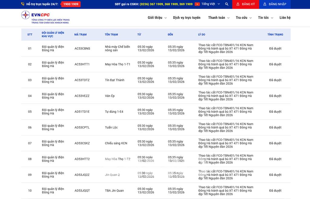 | 7 | Đội quản lý điện Đông Hà | AD53CSKZ | Chiếu sáng KCN | 05:30 13/02/2026 | 05:35 13/02/2026 | Thao tác cắt FCO-TBN401/16 KCN Nam Đông Hà tránh quá bù XT 471 Đông Hà dịp Tết Nguyên đán 2026 | Đã duyệt |
