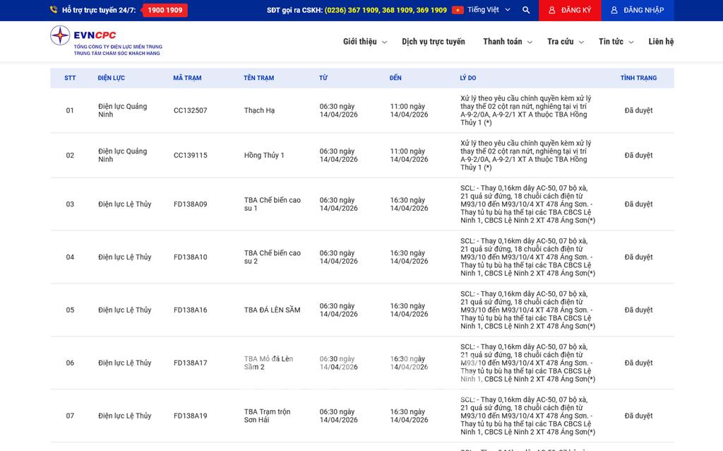 | 1 | Điện lực Quảng Ninh | CC132507 | Thạch Hạ | 06:30 14/04/2026 | 11:00 14/04/2026 | Xử lý theo yêu cầu chính quyền kèm xử lý thay thế 02 cột rạn nứt, nghiêng tại vị trí A-9-2/0A, A-9-2/1 XT A thuộc TBA Hồng Thủy 1 (*) | Đã duyệt |