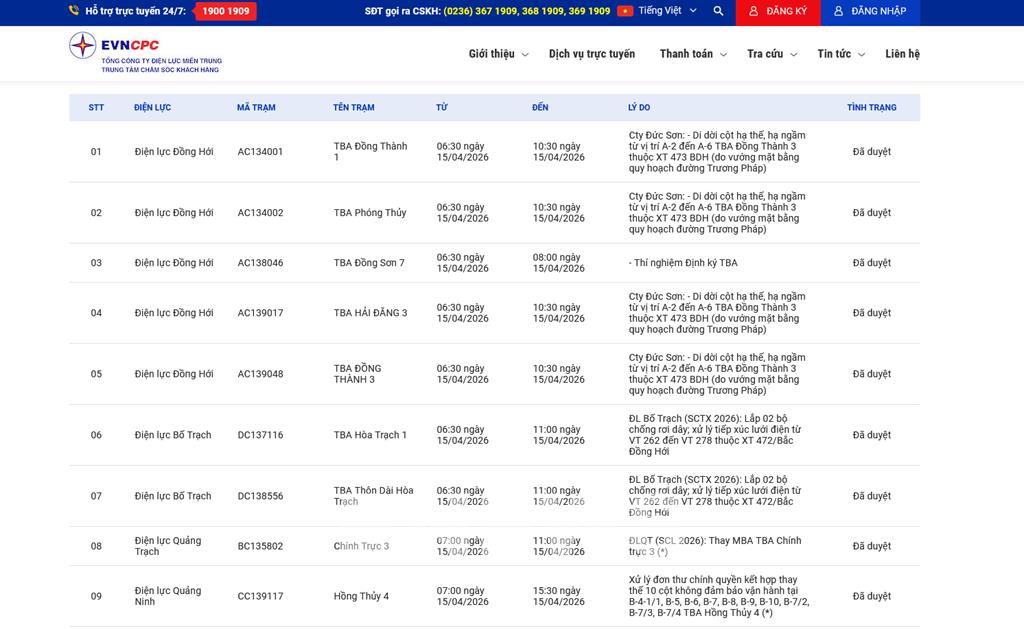 | 7 | Điện lực Bố Trạch | DC138556 | TBA Thôn Dài Hòa Trạch | 06:30 15/04/2026 | 11:00 15/04/2026 | ĐL Bố Trạch (SCTX 2026): Lắp 02 bộchống rơi dây; xử lý tiếp xúc lưới điệntừ VT 262 đến VT 278 thuộc XT472/Bắc Đồng Hới | Đã duyệt |
