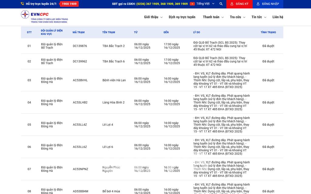 | 9 | Đội quản lý điện Đông Hà | AD53PHDH | KTX Đại học Huế | 06:00 16/12/2025 | 16:00 16/12/2025 | - ĐH: VS, XLT đường dây. Phát quang hành lang tuyến (xử lý đơn thư khách hàng).- Thịnh Nhi: Dựng cột, lắp xà, phụ kiện, thay dây khoảng VT 01 - VT 08 và khoảng VT 15 - VT 17 XT 485 ĐHA (ĐTXD 2025) | Đã duyệt |