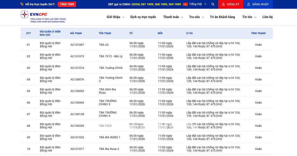 | 8 | Đội quản lý điện Đồпg Hới | AC139209 | TBA F325 | 06:30 17/01/2026 | 11:00 17/01/2026 | Lắp đặt các bộ chống rơi dây tại vị trí 124, 139, 144 thuộc XT 475 DHO | Hoãn |