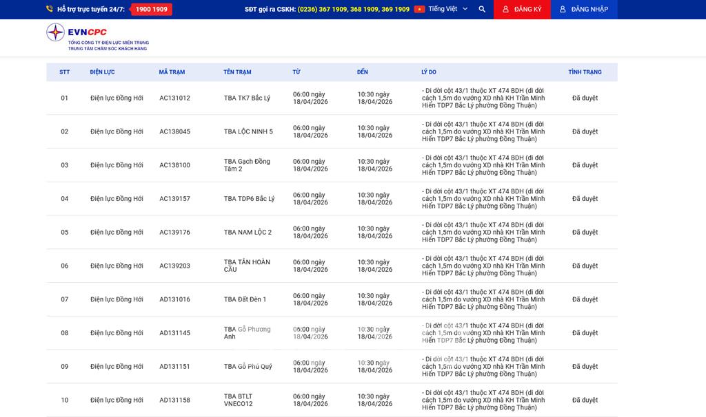 | 1 | Điện lực Đồпg Hới | AC131012 | TBA TK7 Bắc Lý | 06:00 18/04/2026 | 10:30 18/04/2026 | - Di dời cột 43/1 thuộc XT 474 BDH (di dời cách 1,5m do vướng XD nhà KH Trần Minh Hiển TDP7 Bắc Lý phường Đồng Thuận) | Đã duyệt |