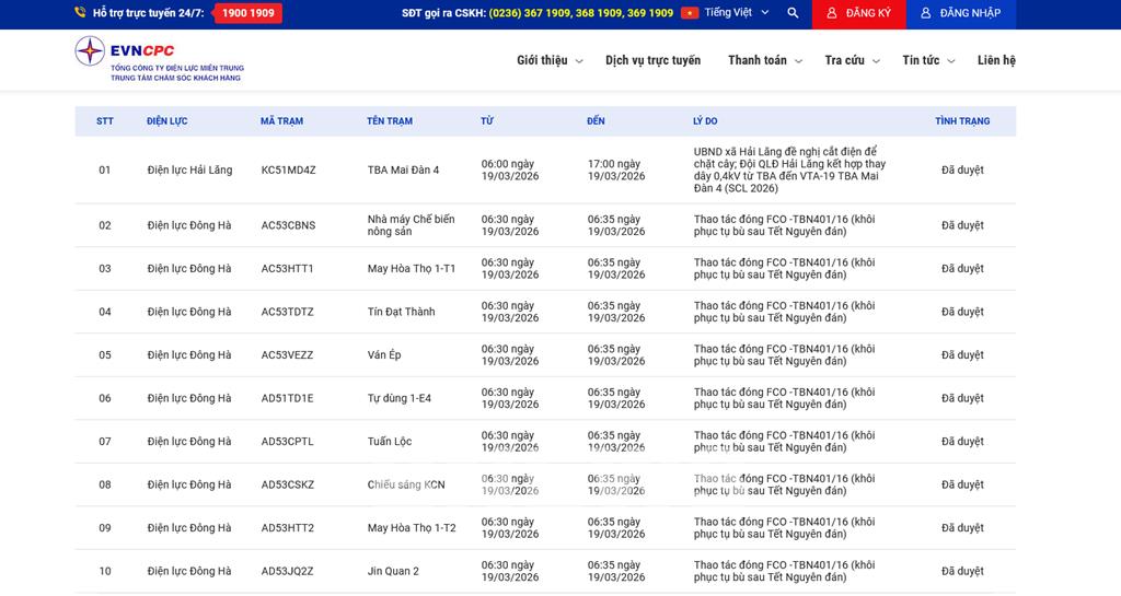| 2 | Điện lực Đông Hà | AC53CBNS | Nhà máy Chế biến nông sản | 06:30 19/03/2026 | 06:35 19/03/2026 | Thao tác đóng FCO -TBN401/16 (khôi phục tụ bù sau Tết Nguyên đán) | Đã duyệt |