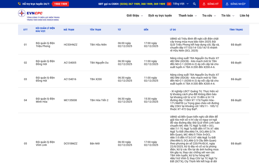 | 7 | Đội quản lý điện Vĩnh Linh | DC51T1CT | T1- Cây Tràm | 06:30 02/12/2025 | 17:00 02/12/2025 | UBND xã Bến Quan kiến nghị cắt điện để giải tỏa một số vị trí cây có nguy cơ ngã đỗ vào đường dây; Đội QLĐ Vĩnh Linh luân chuyển MC 486 TC Ngã Tư Đất + DCL 486-7/1 TC Ngã Tư Đất đến VT7A XT 486 Ngã Tư Đất (Rec486/7A, DCL486-2/7A Bến Quan), MC 486/5 Thôn 5+DCL 486-7/5 đến VT3/3 XT 486 Ngã Tư Đất (Rec486/3, DCL486-2/3 Cầu Bến Quan) theo phương án số 220/PA-ĐLVL ngày 22/8/2025; Xử lý dây vô cổ sứ bị phóng điện; Xử lý các tồn tại do ảnh hưởng mưa lớn gây ra, thay các chống sét van các TBA trên tuyến; Xử lý hư hỏng MC 486/163 Vĩnh Ô, thay CSV tại TC Ngã Tư Đất (SCTX); Cty Thịnh Nhi kết hợp di dời các vị trí cột VT57-60 XT 476 Ngã Tư Đất (Phục vụ thi công dự án cao tốc Bắc Nam phía Đông GĐ 2021-2025) | Đã duyệt |