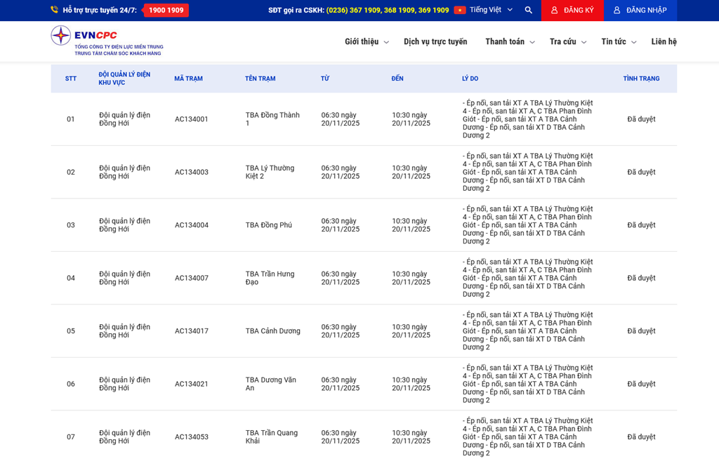 | 6 | Đội quản lý điện Đồпg Hới | AC134021 | TBA Dương Văn An | 06:30 20/11/2025 | 10:30 20/11/2025 | - Ép nối, san tải XT A TBA Lý Thường Kiệt 4- Ép nối, san tải XT A, C TBA Phan Đình Giót- Ép nối, san tải XT A TBA Cảnh Dương- Ép nối, san tải XT D TBA Cảnh Dương 2 | Đã duyệt |