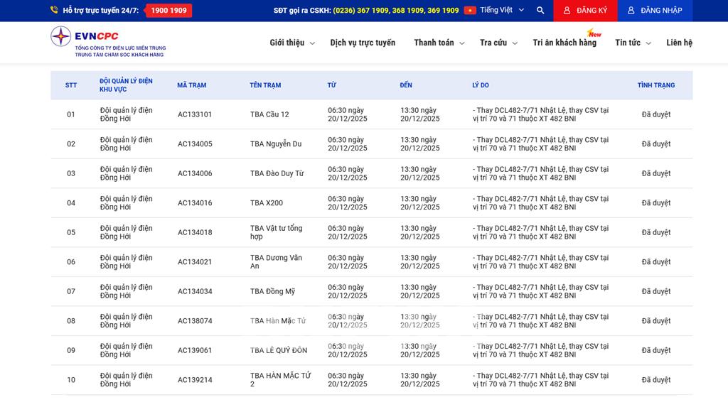 | 9 | Đội quản lý điện Đồпg Hới | AC139061 | TBA LÊ QUÝ ĐÔN | 06:30 20/12/2025 | 13:30 20/12/2025 | - Thay DCL482-7/71 Nhật Lệ, thay CSV tại vị trí 70 và 71 thuộc XT 482 BNI | Đã duyệt |