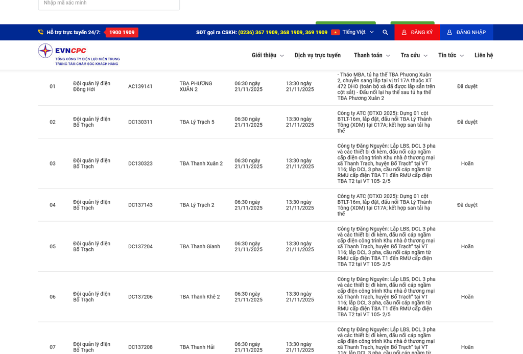 | 8 | Đội quản lý điện Bố Trạch | DC138207 | TBA Lý Trạch 3 | 06:30 21/11/2025 | 13:30 21/11/2025 | Công ty ATC (ĐTXD 2025): Dựng 01cột BTLT-16m, lắp đặt, đấu nối TBALý Thánh Tông (XDM) tại C17A; kếthợp san tải hạ thế | Đã duyệt |