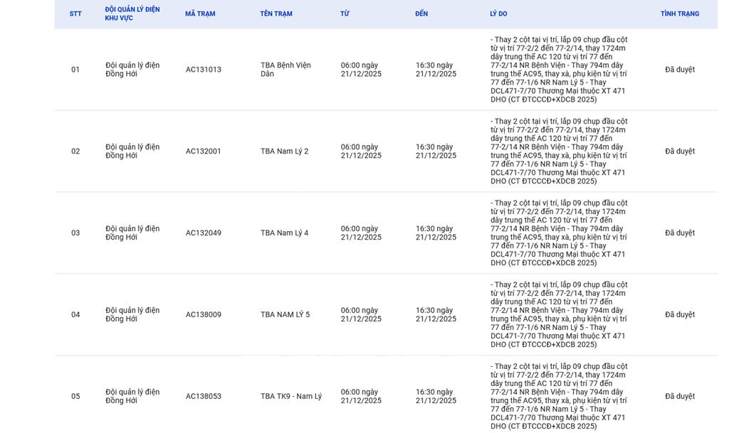 | 4 | Đội quản lý điện Đồпg Hới | AC138009 | TBA NAM LÝ 5 | 06:00 21/12/2025 | 16:30 21/12/2025 | - Thay 2 cột tại vị trí, lắp 09 chụp đầu cột từ vị trí 77-2/2 đến 77-2/14, thay 1724m dây trung thế AC 120 từ vị trí 77 đến 77-2/14 NR Bệnh Viện- Thay 794m dây trung thế AC95, thay xà, phụ kiện từ vị trí 77 đến 77-1/6 NR Nam Lý 5- Thay DCL471-7/70 Thương Mại thuộc XT 471 DHO (CT ĐTCCCĐ+XDCB 2025) | Đã duyệt |