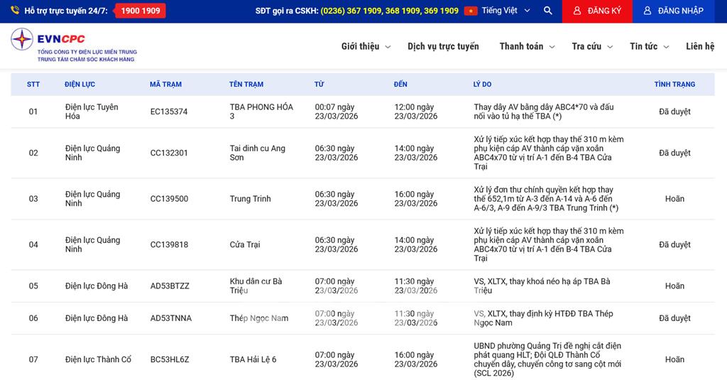| 6 | Điện lực Đông Hà | AD53TNNA | Thép Ngọc Nam | 07:00 23/03/2026 | 11:30 23/03/2026 | VS, XLTX, thay định kỳ HTĐĐ TBA Thép Ngọc Nam | Đã duyệt |