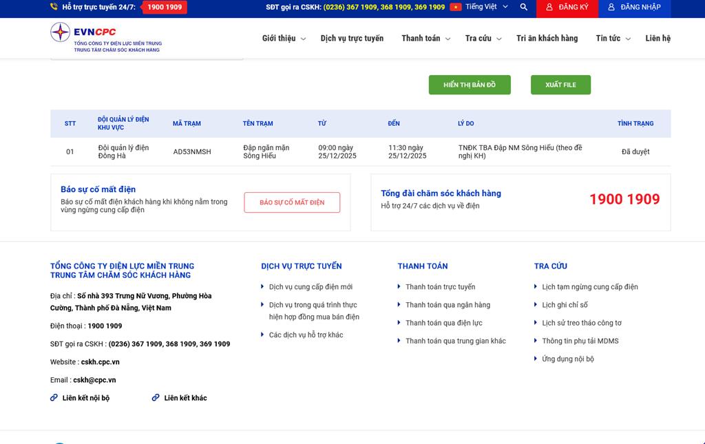 | 1 | Đội quản lý điện Đông Hà | AD53NMSH | Đập ngăn mặn Sông Hiếu | 09:00 25/12/2025 | 11:30 25/12/2025 | TNĐK TBA Đập NM Sông Hiếu (theo đề nghị KH) | Đã duyệt |