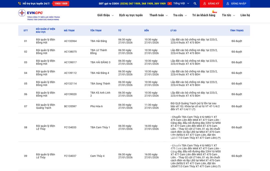 | 6 | Đội quản lý điện Đồпg Hới | AD139020 | TBA KS Anh Linh 2 | 06:30 27/01/2026 | 10:30 27/01/2026 | Lắp đặt các bộ chống rơi dây: tại 223/2, 223/4 thuộc XT 473 BDH | Đã duyệt |