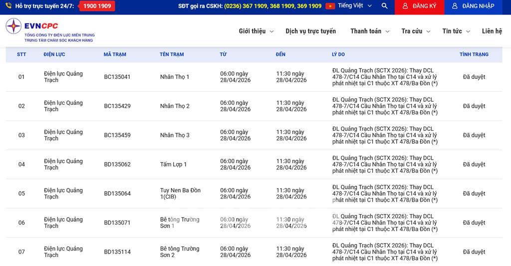 | 7 | Điện lực Quảng Trạch | BD135114 | Bê tông Trường Sơn 2 | 06:00 28/04/2026 | 11:30 28/04/2026 | ĐL Quảng Trạch (SCTX 2026): Thay DCL 478-7/C14 Cầu Nhân Thọ tại C14 và xử lý phát nhiệt tại C1 thuộc XT 478/Ba Đồn (*) | Đã duyệt |