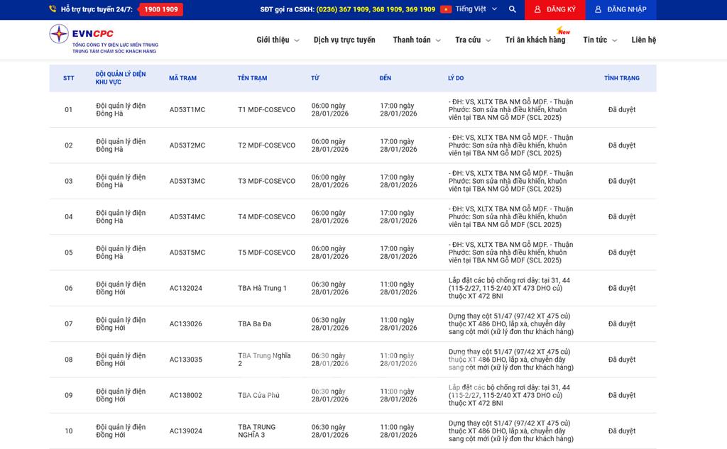 | 8 | Đội quản lý điện Đồпg Hới | AC133035 | TBA Trung Nghĩa 2 | 06:30 28/01/2026 | 11:00 28/01/2026 | Dựng thay cột 51/47 (97/42 XT 475 củ) thuộc XT 486 DHO, lắp xà, chuyễn dây sang cột mới (xữ lý đơn thư khách hàng) | Đã duyệt |
