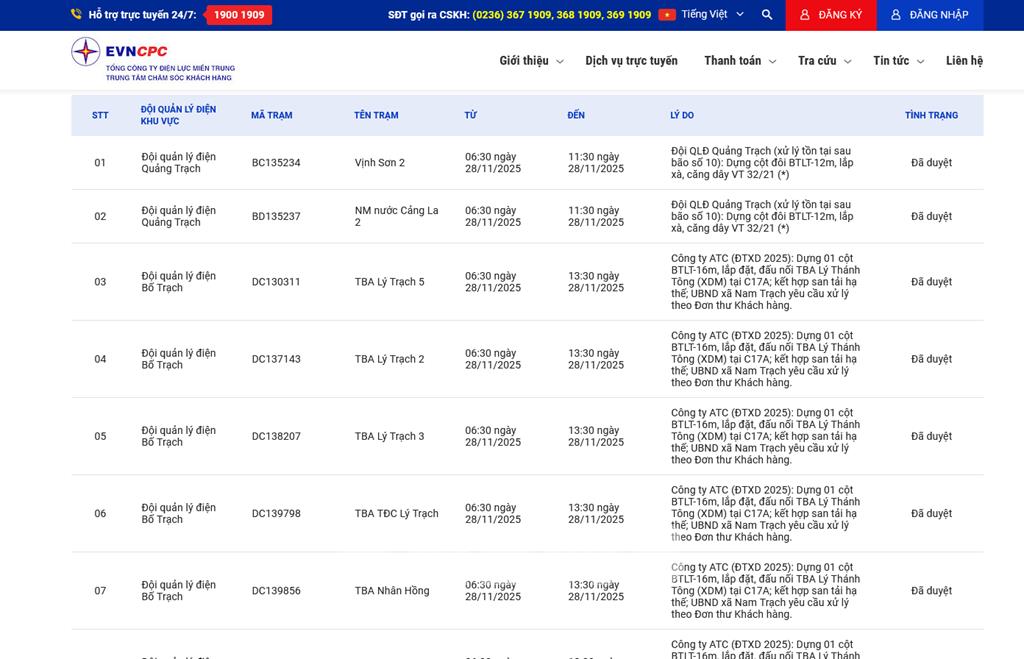 | 8 | Đội quản lý điện Bố Trạch | DC139927 | TBA Nhân Hồng 2 | 06:30 28/11/2025 | 13:30 28/11/2025 | Công ty ATC (ĐTXD 2025): Dựng 01cột BTLT-16m, lắp đặt, đấu nối TBALý Thánh Tông (XDM) tại C17A; kếthợp san tải hạ thế; UBND xã Nam Trạch yêu cầu xử lý theo Đơn thư Khách hàng. | Đã duyệt |