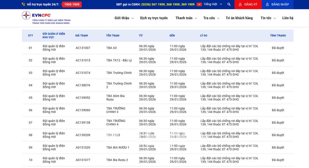| 6 | Đội quản lý điện Đồпg Hới | AC139060 | TBA TRƯỜNG CHINH 3 | 06:30 29/01/2026 | 11:00 29/01/2026 | Lắp đặt các bộ chống rơi dây tại vị trí 124, 139, 144 thuộc XT 475 DHO | Đã duyệt |