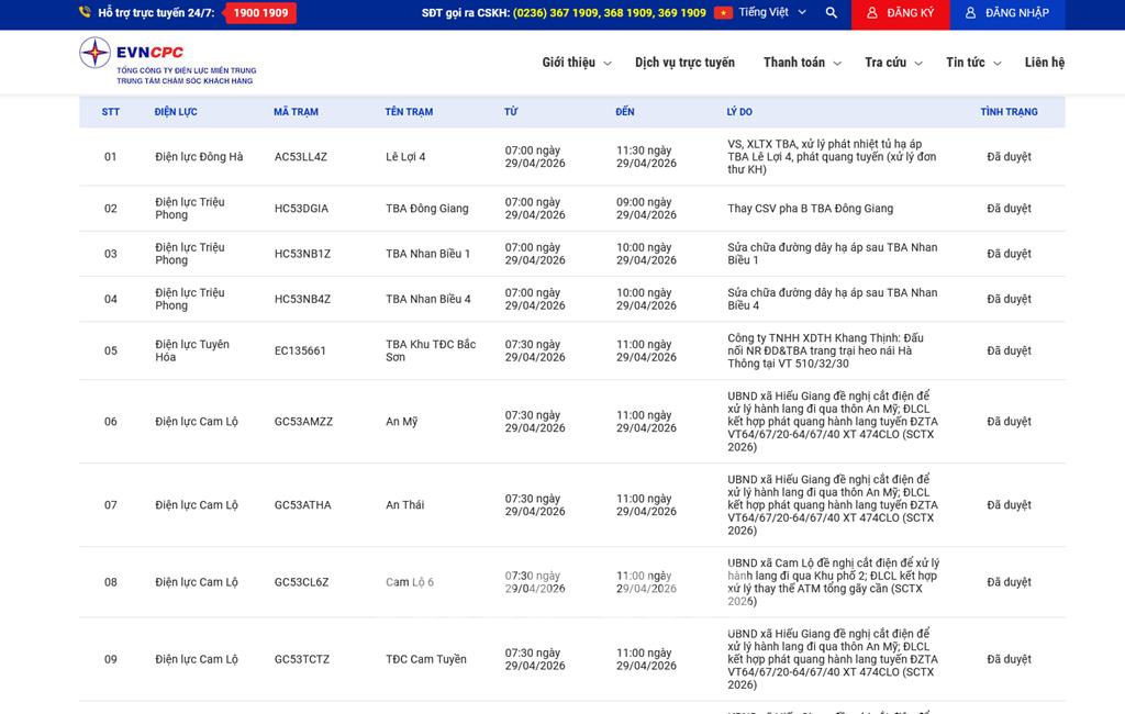 | 4 | Điện lực Triệu Phong | HC53NB4Z | TBA Nhan Biều 4 | 07:00 29/04/2026 | 10:00 29/04/2026 | Sửa chữa đường dây hạ áp sau TBA Nhan Biều 4 | Đã duyệt |