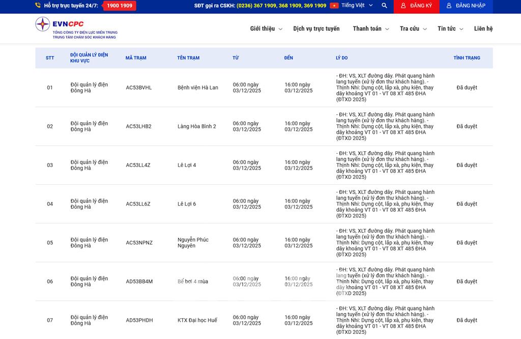 | 7 | Đội quản lý điện Đông Hà | AD53PHDH | KTX Đại học Huế | 06:00 03/12/2025 | 16:00 03/12/2025 | - ĐH: VS, XLT đường dây. Phát quang hành lang tuyến (xử lý đơn thư khách hàng).- Thịnh Nhi: Dựng cột, lắp xà, phụ kiện, thay dây khoảng VT 01 - VT 08 XT 485 ĐHA (ĐTXD 2025) | Đã duyệt |