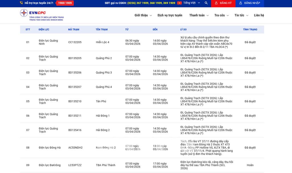 | 10 | Điện lực Quảng Trạch | BC135168 | Quảng Trường 4 | 07:30 03/04/2026 | 13:00 03/04/2026 | ĐLQT (SCL 2026): Thay dây dẫn, thu hồi dây củ XTA TBA Quảng Trường 4 (*) | Đã duyệt |