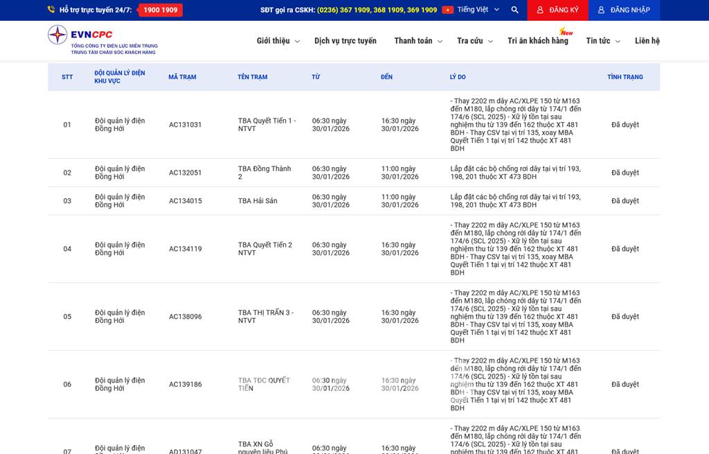 | 3 | Đội quản lý điện Đồпg Hới | AC134015 | TBA Hải Sản | 06:30 30/01/2026 | 11:00 30/01/2026 | Lắp đặt các bộ chống rơi dây tại vị trí 193, 198, 201 thuộc XT 473 BDH | Đã duyệt |