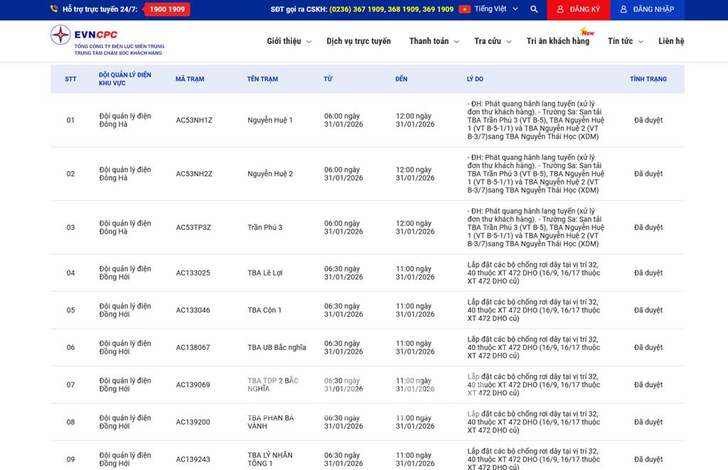 | 1 | Đội quản lý điện Đông Hà | AC53NH1Z | Nguyễn Huệ 1 | 06:00 31/01/2026 | 12:00 31/01/2026 | - ĐH: Phát quang hành lang tuyến (xử lý đơn thư khách hàng).- Trường Sa: San tải TBA Trần Phú 3 (VT B-5), TBA Nguyễn Huệ 1 (VT B-5-1/1) và TBA Nguyễn Huệ 2 (VT B-3/7)sang TBA Nguyễn Thái Học (XDM) | Đã duyệt |