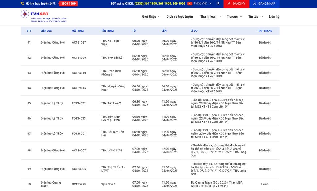 | 4 | Điện lực Đồпg Hới | AC139146 | TBA Nguyễn Công Hoan | 06:00 04/04/2026 | 16:00 04/04/2026 | - Dựng cột, chuyễn dây sang cột mới từ vị trí 86-2/1 đến 86-2/10 NR Khu TT Bệnh Viện thuộc XT 475 DHO | Đã duyệt |