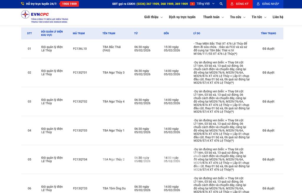 | 2 | Đội quản lý điện Lệ Thủy | FC13QT01 | TBA Ngư Thủy 3 | 06:30 05/02/2026 | 14:00 05/02/2026 | -Dự án đường ven biển: + Thay 04 cột LT-14m, 03 bộ xà, 13 quả sứ đứng, 06 chuỗi cách điện và chuyển dây, căng lại độ võng tại M329/76/6, M329/76/6A, M329/87A XT 476 Lệ Thủy+ Lắp 01 chụp đầu cột, thay 01 bộ xà, 06 quả sứ đứng tại M329/57/4 XT 476 Lệ Thủy(*) | Đã duyệt |