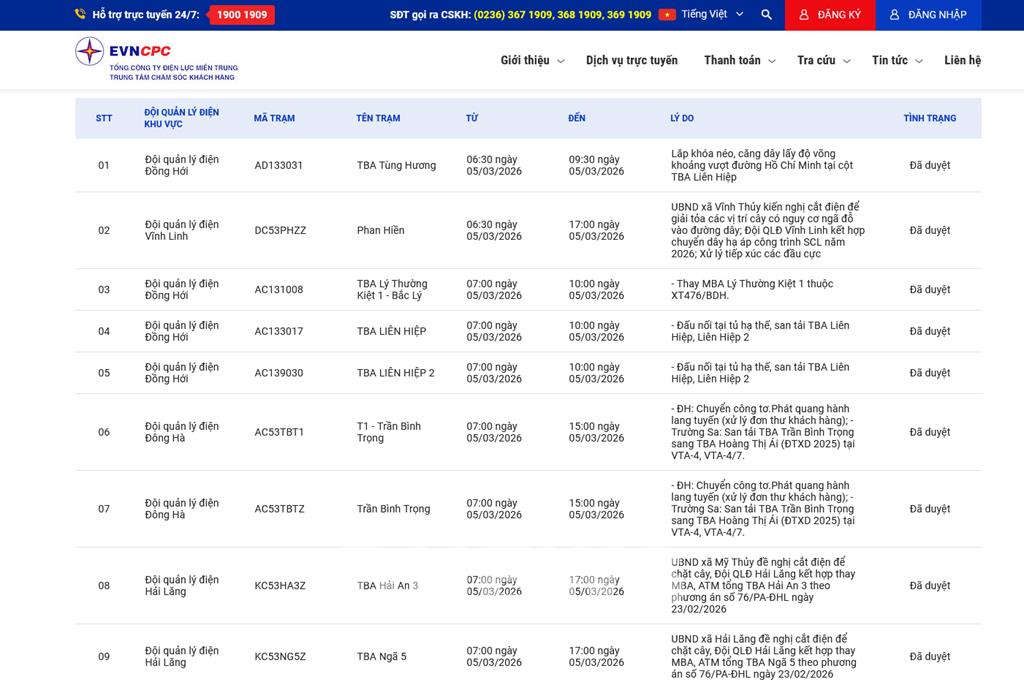 | 10 | Đội quản lý điện Hải Lăng | KD53LHT1 | TBA Long Hưng Thịnh 1 | 07:00 05/03/2026 | 17:00 05/03/2026 | Đội QLĐ Hải Lăng kết hợp thay MBA, ATM tổng TBALong Hưng Thịnh 2 theo phương án số 76/PA-ĐHL ngày 23/02/2026 | Đã duyệt |
