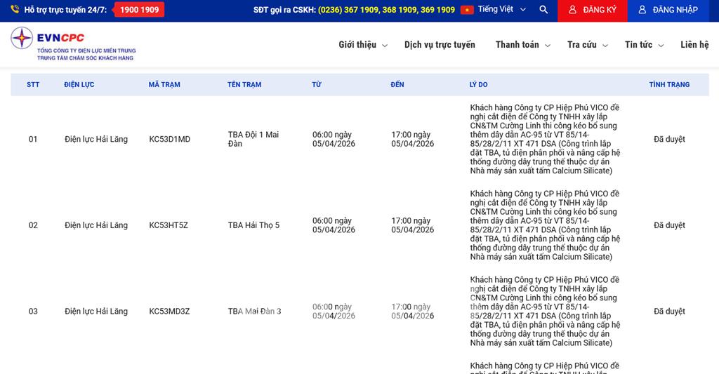 | 2 | Điện lực Hải Lăng | KC53HT5Z | TBA Hải Thọ 5 | 06:00 05/04/2026 | 17:00 05/04/2026 | Khách hàng Công ty CP Hiệp Phú VICO đề nghị cắt điện để Công ty TNHH xây lắp CN&TM Cường Linh thi công kéo bổ sung thêm dây dẫn AC-95 từ VT 85/14- 85/28/2/11 XT 471 DSA (Công trình lắp đặt TBA, tủ điện phân phối và nâng cấp hệ thống đường dây trung thế thuộc dự án Nhà máy sản xuất tấm Calcium Silicate) | Đã duyệt |