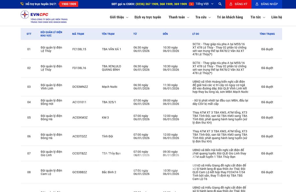 | 9 | Đội quản lý điện Cam Lộ | GC53BBZZ | Bắc Bình | 07:00 06/01/2026 | 10:30 06/01/2026 | UBND xã Hiếu Giang đề nghị cắt điện để xử lý hành lang đi qua thôn An Thái; Đội QLĐ Cam Lộ kết hợp thay FCO474-7/34 Tinh bột sắn, thay TI định kỳ TBA TBS Cam Lộ-T6 | Đã duyệt |
