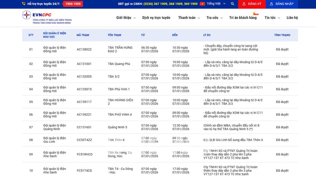| 2 | Đội quản lý điện Đồпg Hới | AC131001 | TBA Quang Phú | 07:00 07/01/2026 | 10:00 07/01/2026 | - Lắp xà néo, căng lại dây khoảng từ D-4/3 đến D-4/3/1 TBA 3/2 | Đã duyệt |