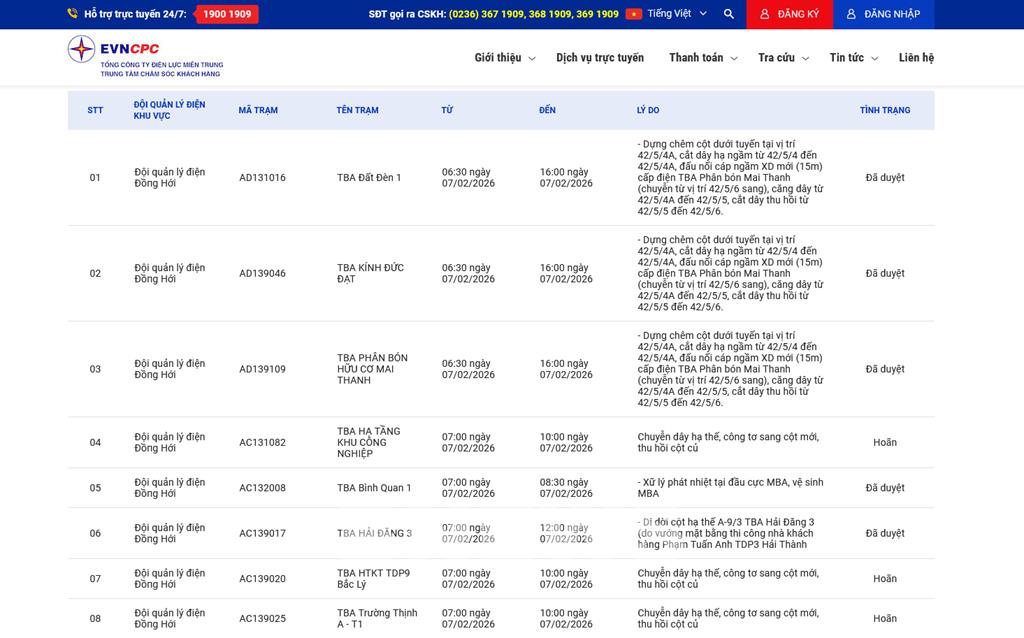| 4 | Đội quản lý điện Đồпg Hới | AC131082 | TBA HẠ TẦNG KHU CÔNG NGHIỆP | 07:00 07/02/2026 | 10:00 07/02/2026 | Chuyễn dây hạ thế, công tơ sang cột mới, thu hồi cột củ | Hoãn |