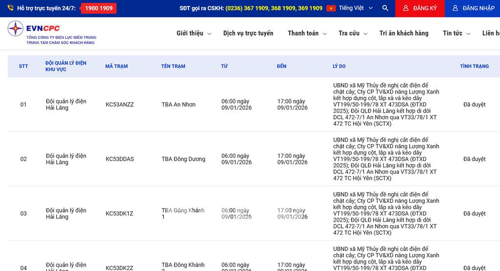 | 6 | Đội quản lý điện Hải Lăng | KC53DKZZ | TBA Diên Khánh | 06:00 09/01/2026 | 17:00 09/01/2026 | UBND xã Mỹ Thủy đề nghị cắt điện để chặt cây; Cty CP TV&XD năng Lượng Xanh kết hợp dựng cột, lắp xà và kéo dây VT199/50-199/78 XT 473DSA (ĐTXD 2025); Đội QLĐ Hải Lăng kết hợp di dời DCL 472-7/1 An Nhơn qua VT33/78/1 XT 472 TC Hội Yên (SCTX) | Đã duyệt |