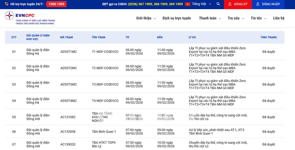 | 5 | Đội quản lý điện Đồпg Hới | AC131082 | TBA HẠ TẦNG KHU CÔNG NGHIỆP | 07:00 09/02/2026 | 10:00 09/02/2026 | Chuyễn dây hạ thế, công tơ sang cột mới, thu hồi cột củ | Đã duyệt |