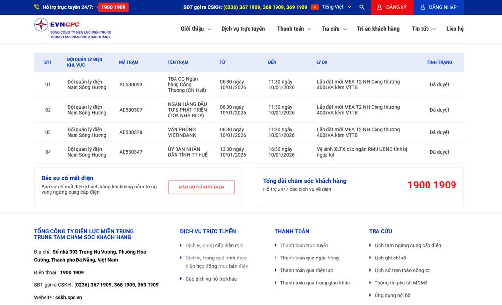 | 2 | Đội quản lý điện Nam Sông Hương | AD530307 | NGÂN HÀNG ĐẦU TƯ & PHÁT TRIỂN (TÒA NHÀ BIDV) | 06:30 10/01/2026 | 11:30 10/01/2026 | Lắp đặt mới MBA T2 NH Công thương 400kVA kèm VTTB | Đã duyệt |