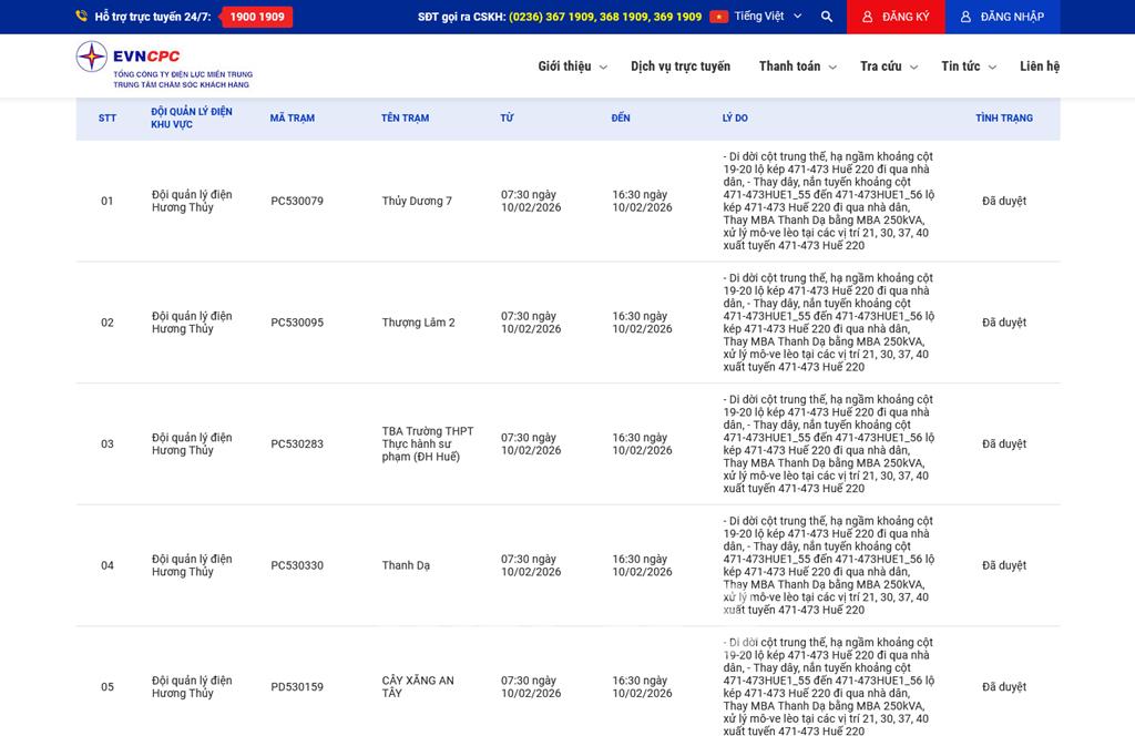 | 3 | Đội quản lý điện Hương Thủy | PC530283 | TBA Trường THPT Thực hành sư phạm (ĐH Huế) | 07:30 10/02/2026 | 16:30 10/02/2026 | - Di dời cột trung thế, hạ ngầm khoảng cột 19-20 lộ kép 471-473 Huế 220 đi qua nhà dân,- Thay dây, nắn tuyến khoảng cột 471-473HUE1_55 đến 471-473HUE1_56 lộ kép 471-473 Huế 220 đi qua nhà dân, Thay MBA Thanh Dạ bằng MBA 250kVA, xử lý mô-ve lèo tại các vị trí 21, 30, 37, 40 xuất tuyến 471-473 Huế 220 | Đã duyệt |