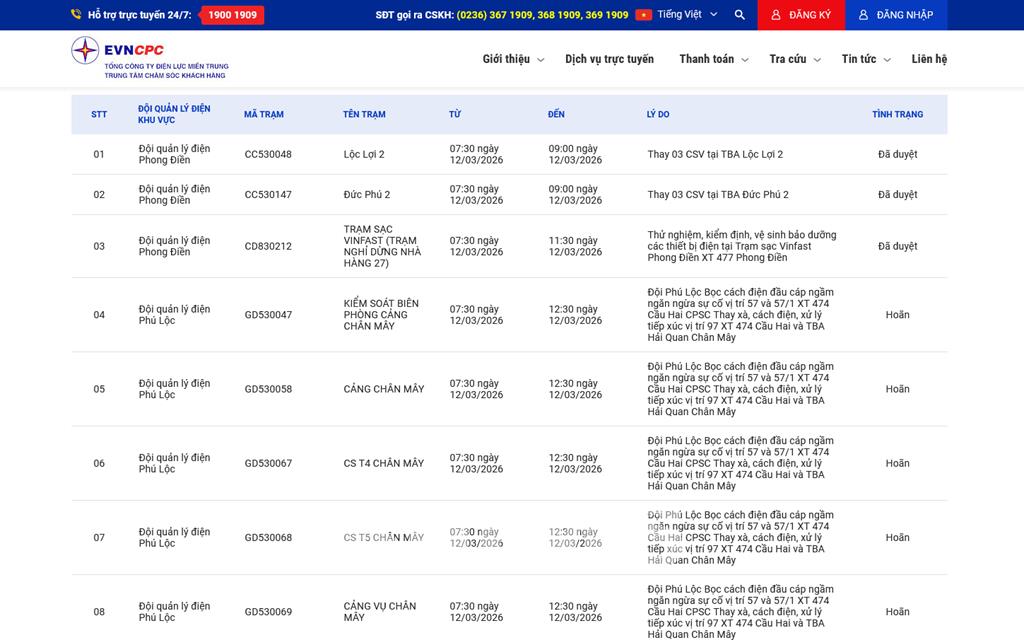 | 2 | Đội quản lý điện Phong Điền | CC530147 | Đức Phú 2 | 07:30 12/03/2026 | 09:00 12/03/2026 | Thay 03 CSV tại TBA Đức Phú 2 | Đã duyệt |