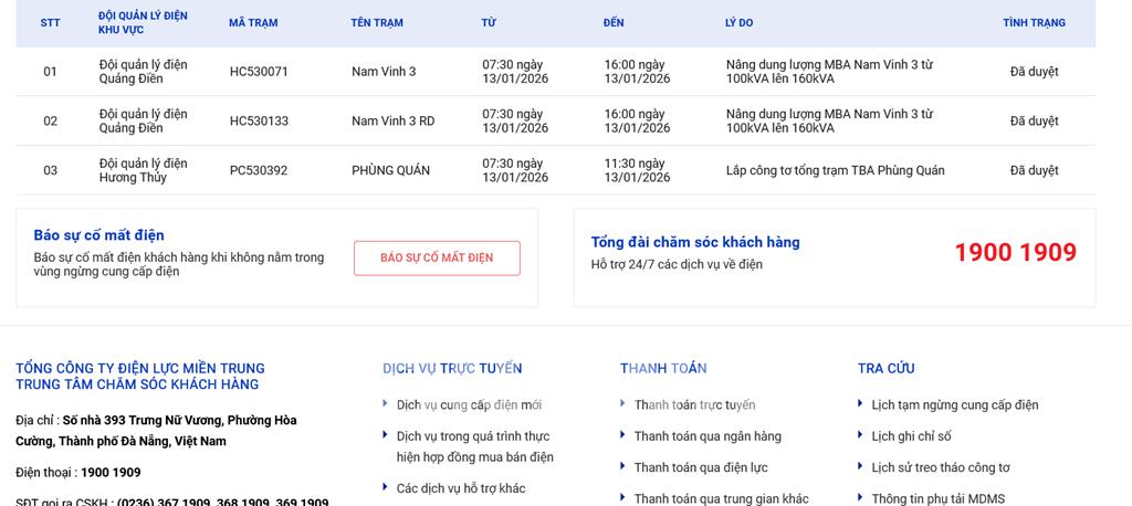 | 1 | Đội quản lý điện Quảng Điền | HC530071 | Nam Vinh 3 | 07:30 13/01/2026 | 16:00 13/01/2026 | Nâng dung lượng MBA Nam Vinh 3 từ 100kVA lên 160kVA | Đã duyệt |