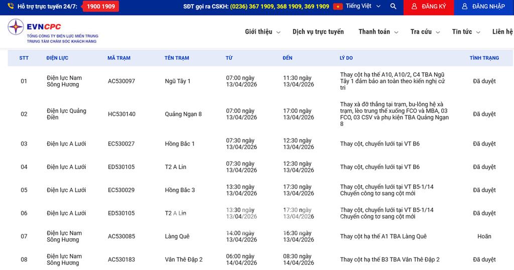 | 7 | Điện lực Nam Sông Hương | AC530085 | Làng Quê | 14:00 13/04/2026 | 16:30 13/04/2026 | Thay cột hạ thế A1 TBA Làng Quê | Hoãn |