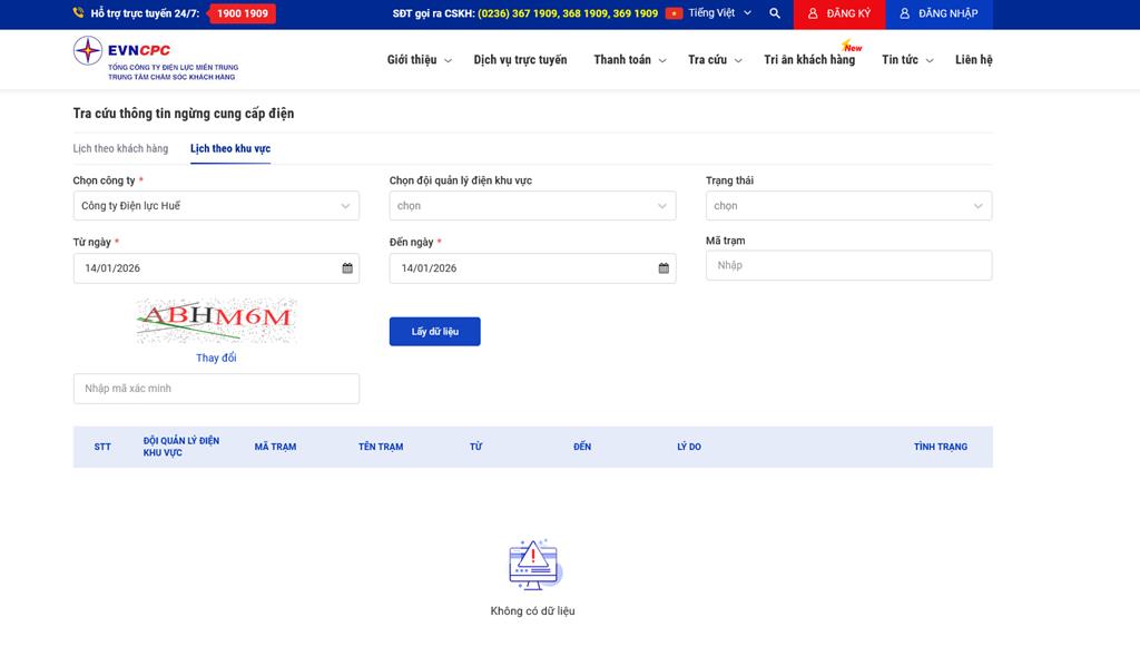 Lịch cắt điện thành phố Huế ngày mai 14/1 trên website của EVNCPC cập nhật ngày 13/1. Ảnh: Bnews/vnanet.vn