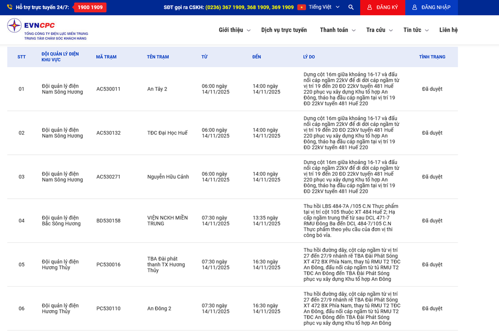 | 4 | Đội quản lý điện Bắc Sông Hương | BD530158 | VIỆN NCKH MIỀN TRUNG | 07:30 14/11/2025 | 13:35 14/11/2025 | Thu hồi LBS 484-7A /105 C.N Thực phẩm tại vị trí cột 105 thuộc XT 484 Huế 2;Hạ cấp ngầm trung thế từ sau DCL 471-7 RMU Đông Ba đến DCL 484-7/105 C.N Thực phẩm theo yêu cầu của đơn vị thi công bó vỉa. | Đã duyệt |