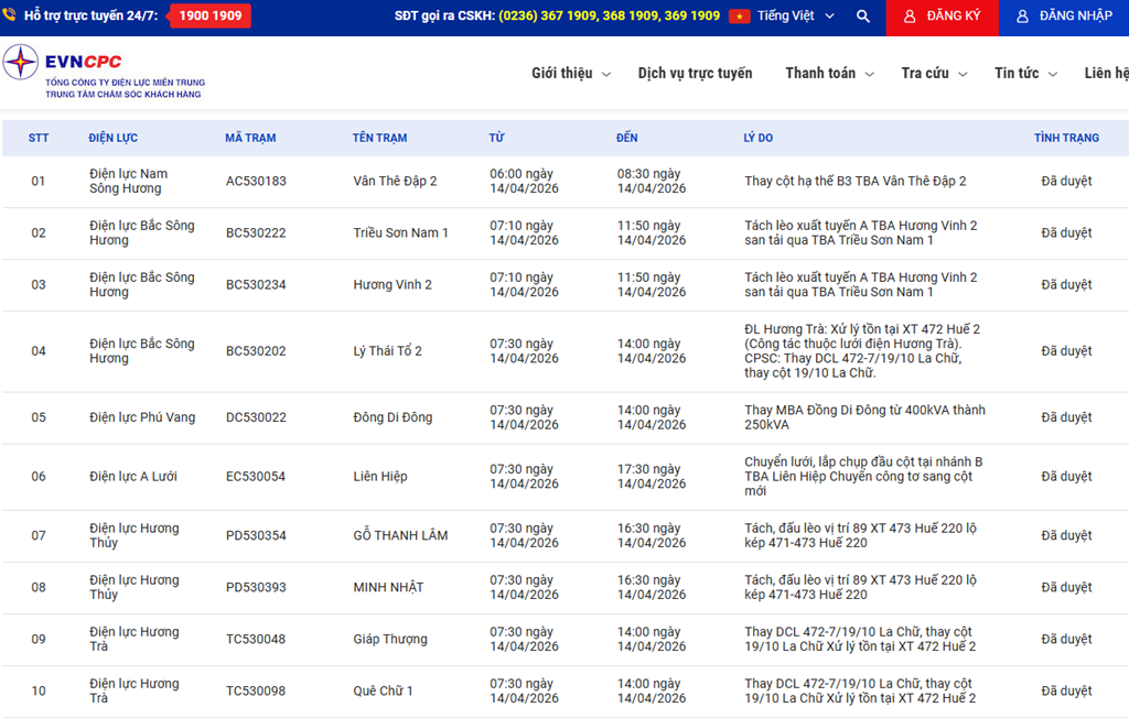 | 10 | Điện lực Hương Trà | TC530098 | Quê Chữ 1 | 07:30 14/04/2026 | 14:00 14/04/2026 | Thay DCL 472-7/19/10 La Chữ, thay cột 19/10 La ChữXử lý tồn tại XT 472 Huế 2 | Đã duyệt |