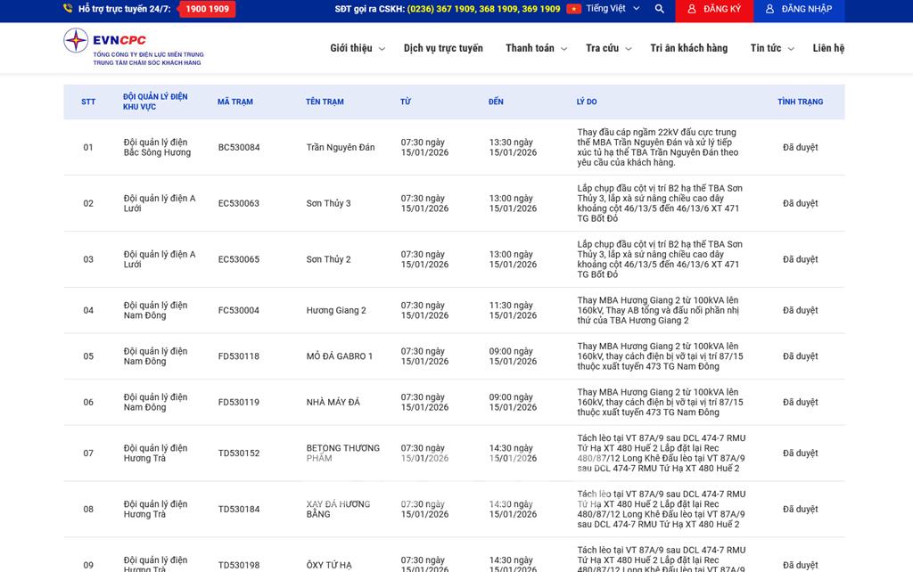 | 1 | Đội quản lý điện Bắc Sông Hương | BC530084 | Trần Nguyên Đán | 07:30 15/01/2026 | 13:30 15/01/2026 | Thay đầu cáp ngầm 22kV đấu cực trung thế MBA Trần Nguyên Đán và xử lý tiếp xúc tủ hạ thể TBA Trần Nguyên Đán theo yêu cầu của khách hàng. | Đã duyệt |