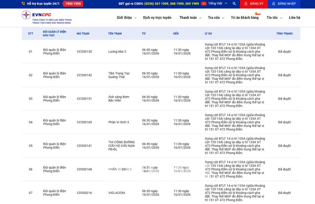 | 2 | Đội quản lý điện Phong Điền | CC530142 | TBA Trang Trại Quảng Thái | 06:30 16/01/2026 | 11:30 16/01/2026 | Dựng cột BTLT 14 vị trí 133A (giữa khoảng cột 133-134) căng lại dây vị trí 133A XT 472 Phong Điền xử lý khoảng cách pha đất.Thay thế MOF đo đếm trung thế tại vị trí 151 XT 472 Phong Điền. | Đã duyệt |