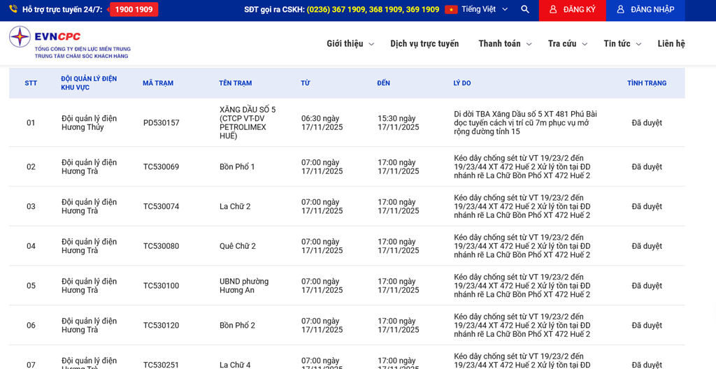 Lịch cắt điện thành phố Huế ngày mai 16/11 trên website của EVNCPC cập nhật ngày 15/11. Ảnh: Bnews/vnanet.vn